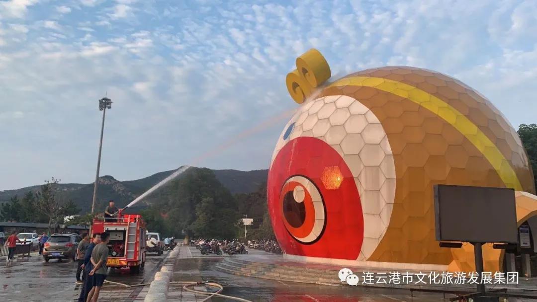 9月25日下午1時左右,大圣公司、360極限飛球工作人員、景區(qū)消防隊聯(lián)合清洗公司一起在花果山風景區(qū)五圣廣場的360極限飛球,開展了建筑外立面的清洗工作。