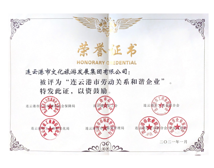 近日,文旅集團被授予連云港市“勞動關系和諧企業(yè)”榮譽稱號。該項榮譽由市人社局、市總工會、市工信局、市市場監(jiān)管局、市工商聯(lián)、市企業(yè)聯(lián)合會/企業(yè)家協(xié)會等部門聯(lián)合頒發(fā)。
