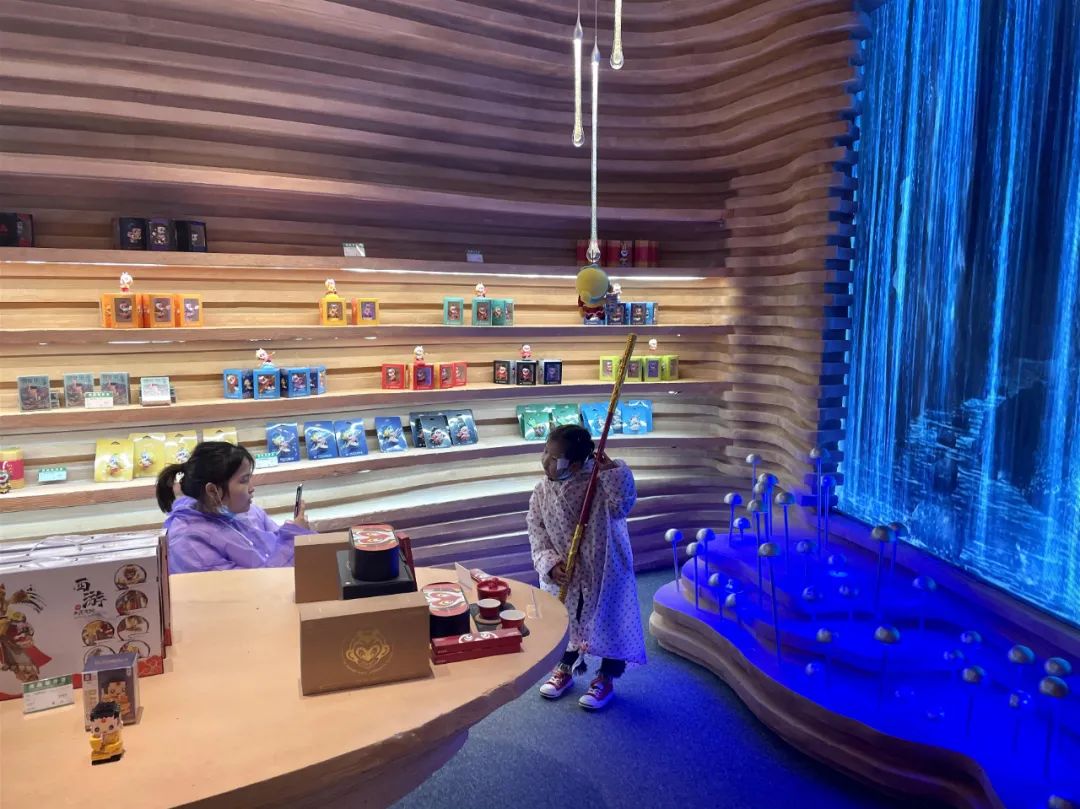 大圣公司西游文創(chuàng)旗艦店自五一開業(yè)以后,游客絡(luò)繹不絕,已成為花果山景區(qū)一道亮麗的風(fēng)景線。西游文創(chuàng)店取山水之意,采用自然色之光,延續(xù)西游文化,大量采用木質(zhì)等自然環(huán)保素材表現(xiàn)山水的形態(tài),通過形態(tài)與元素提煉,傳達出山水之韻,又透射出西游文化之意。漁夫帽、泡泡槍、泡泡棒、積木等文創(chuàng)產(chǎn)品讓游客們愛不釋手,幾乎每個進店游客都會帶走幾份文創(chuàng)產(chǎn)品。
