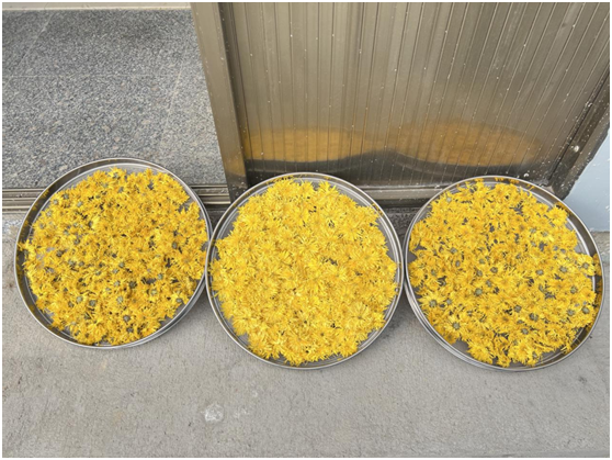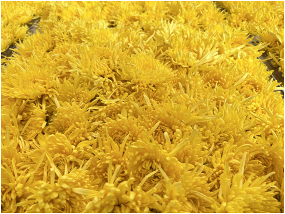 在潤云公司烘干房進行菊花選摘,水分陰干,進行烘烤